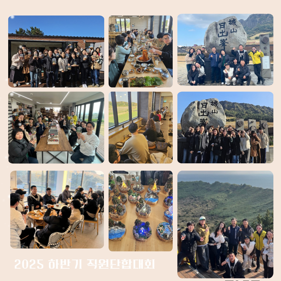 2025 하반기 직원단합대회 최고관리자 0 120 2025.12.12 15:14 2025년 하반기 단합대회 2025년 12월 8일과 12월 11일, 하반기 직원 단합대회를 진행하였습니다. 무드등 만들기 체험, 성산일출봉 등반, 족욕 체험 등 다양한 프로그램을 통해 직원들이 서로 소통하며 편안하게 힐링할 수 있는 시간을 보냈습니다.함께 웃고 걸으며 나눈 따뜻한 순간들은 모두에게 행복한 추억으로 남았습니다. 앞으로도 직원들이 서로를 이해하고 응원하겠습니다.
