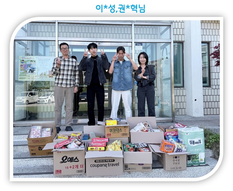 이*성,권*혁님 방문에 감사드립니다. 최고관리자 0 18 04.16 16:22 참조설명 : 후원자님들의 따뜻한 마음에 깊은 감사드립니다. 4/15, 이*성,권*혁님이 아이들을 위해 푸짐한 간식과 다양한 식품(80만원상당)을 전해주셨습니다.아이들이 어떤 간식을 좋아할지 몰라 어릴 적 좋아했던 모든 것을 하나하나 골라 준비해오셨다고 합니다.제주도의 아동생활시설에 대해 먼저 알아보시고 좀 더 많은 아이들이 생활하는 곳을 선택해 방문하셨다고 합니다.후원자님들의 따뜻한 마음에 깊은 감사드립니다.
