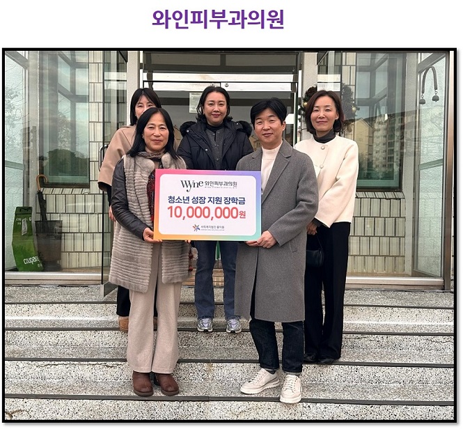 와인피부과의원 방문에 감사드립니다. 최고관리자 0 23 01.08 10:47 참조설명 : 아이들에게 행복한 연말을 선물해주신 와인피부과의원에 감사드립니다. 12/16, 2025년 연말에도 변함없이 와인피부과의원에서 아이들을 위한 청소년 성장 지원장학금 1,000만원을 전달해주셨습니다.아이들의 건강하고 행복한 미래를 위해 따뜻한 사랑으로 응원해주시는 와인피부과의원 원장님과 모든 직원분들께 깊은 감사드립니다. 새해 복 많이 받으세요.