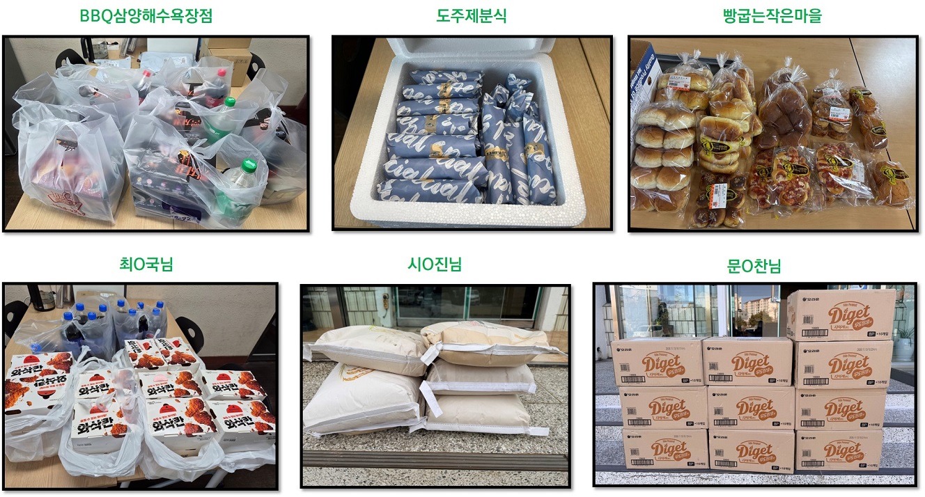 후원자님들께 감사드립니다. 최고관리자 0 3 03.04 11:22 참조설명 : 새해 복 많이 받으세요. - BBQ삼양해수욕장점(치킨16마리)- 도주제분식(두쫀쿠김밥51개)- 빵굽는작은마을(식빵11개,빵20개)- 최O국님(치킨20마리)- 시O진님(쌀60kg)- 문O찬님(과자10박스)