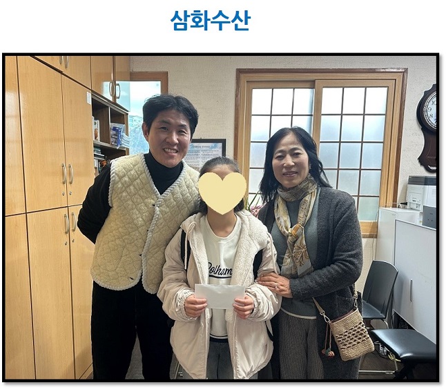 '삼화수산' 방문에 감사드립니다. 최고관리자 0 8 12.04 17:51 참조설명 : 12/4, 삼화지구에 위치한 '삼화수산'에서 방문해주셨습니다.연말을 맞아 아이들을 위해 아동개인결연 후원금100만원으로 초등생 1명,중학생 1명에게 각50만원의 후원금을 전달해주셨습니다.추워진 날씨에 따뜻한 온정을 베풀어주신 '삼화수산'에 깊은 감사드립니다.행복한 연말 보내시기 바랍니다.