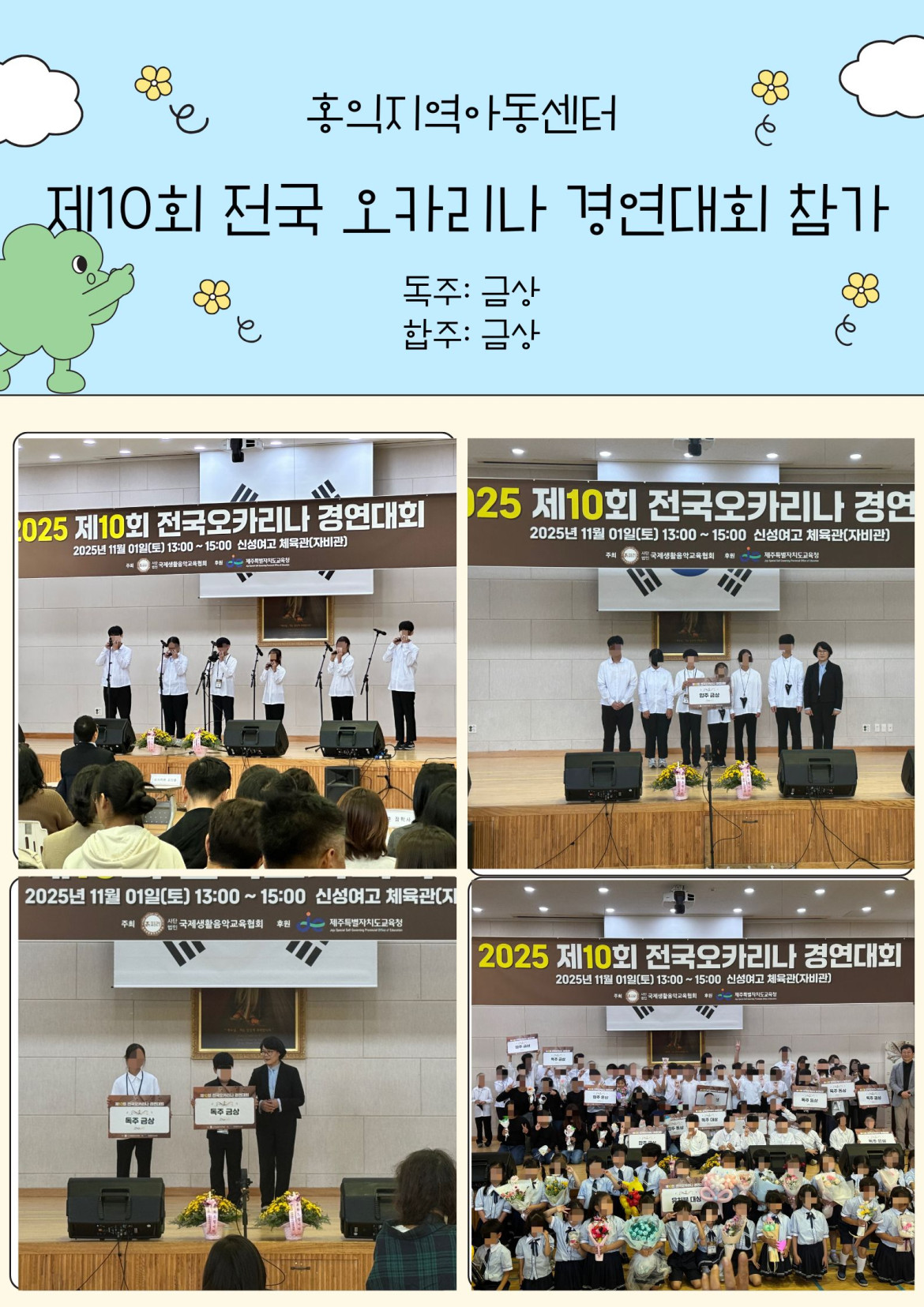 제10회 전국 오카리나 경연대회 참가 센터장 0 172 2025.11.03 15:56 이번 2025년 11월 1일 전국 오카리나 경연대회가 10회기를 맞이하였으며, 홍익지역아동센터 오카리나 팀이 참가하게 되었습니다!!아이들이 많은 사람들 앞에서 공연하는게 많이 떨렸지만, 그래도 연습한 만큼 열심히 해서 독주 부문 금상, 합주 부문 금상을 받았습니다!내년에도 오카리나 경연대회가 있다면 더 열심히 노력해서 그때는 대상을 노려보고 싶다고 말하며,앞으로 오카리나 연습을 연습하여 더욱 더 멋있는 곡으로 공연하고 싶다고 합니다!내년에 더 멋진 홍익지역아동센터 오카리나 팀을 위해 응원 부탁드릴게요 ^^
