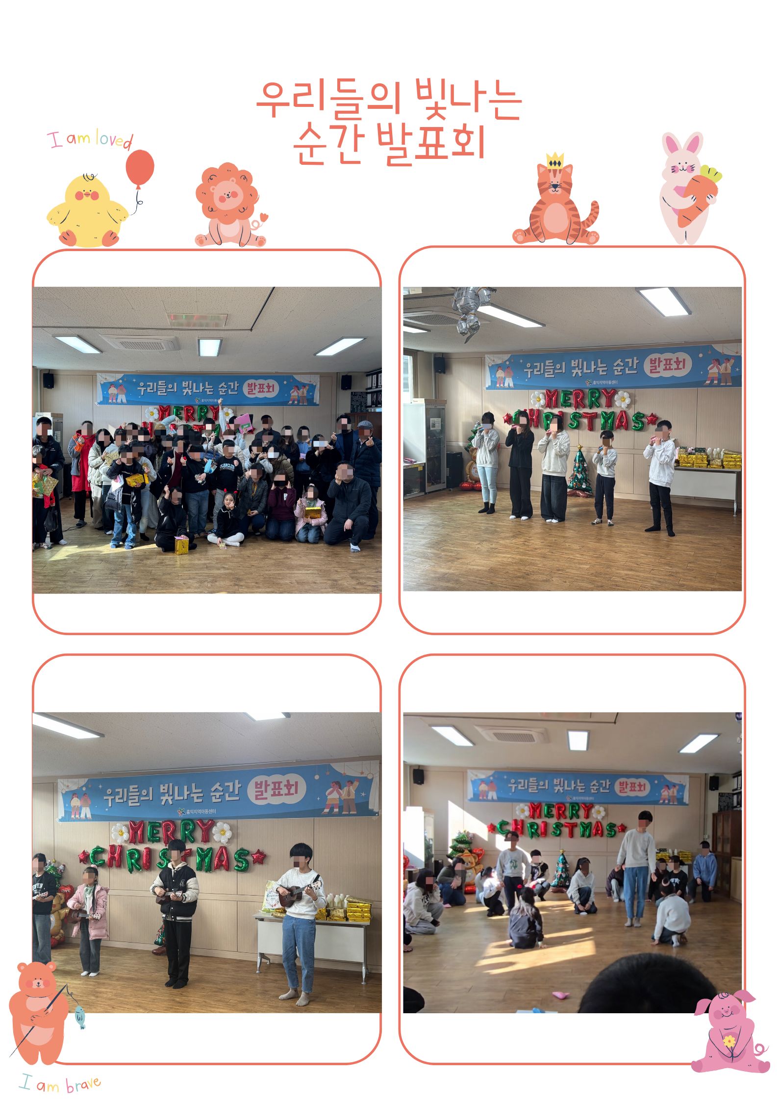 우리들의 빛나는 순간 발표회 센터장 0 87 2025.12.27 13:09 12월 27일 홍익지역아동센터에서 '우리들의 빛나는 순간' 발표회를 진행하였습니다.오카리나, 우쿨렐레 등 여러가지 프로그램을 연습하여 발표회를 통해 한 해를 잘 마무리 했습니다. 아이들이 많은 사람들 앞에서 공연을 하자니 많이 긴장되어 보였지만,그래도 학부모, 내빈 분들께서 힘찬 응원덕에 아이들이 힘 입어 더 열심히 하였습니다.2026년에도 열심히 프로그램을 배워 더 멋있는 모습으로 찾아뵐려고 합니다!!