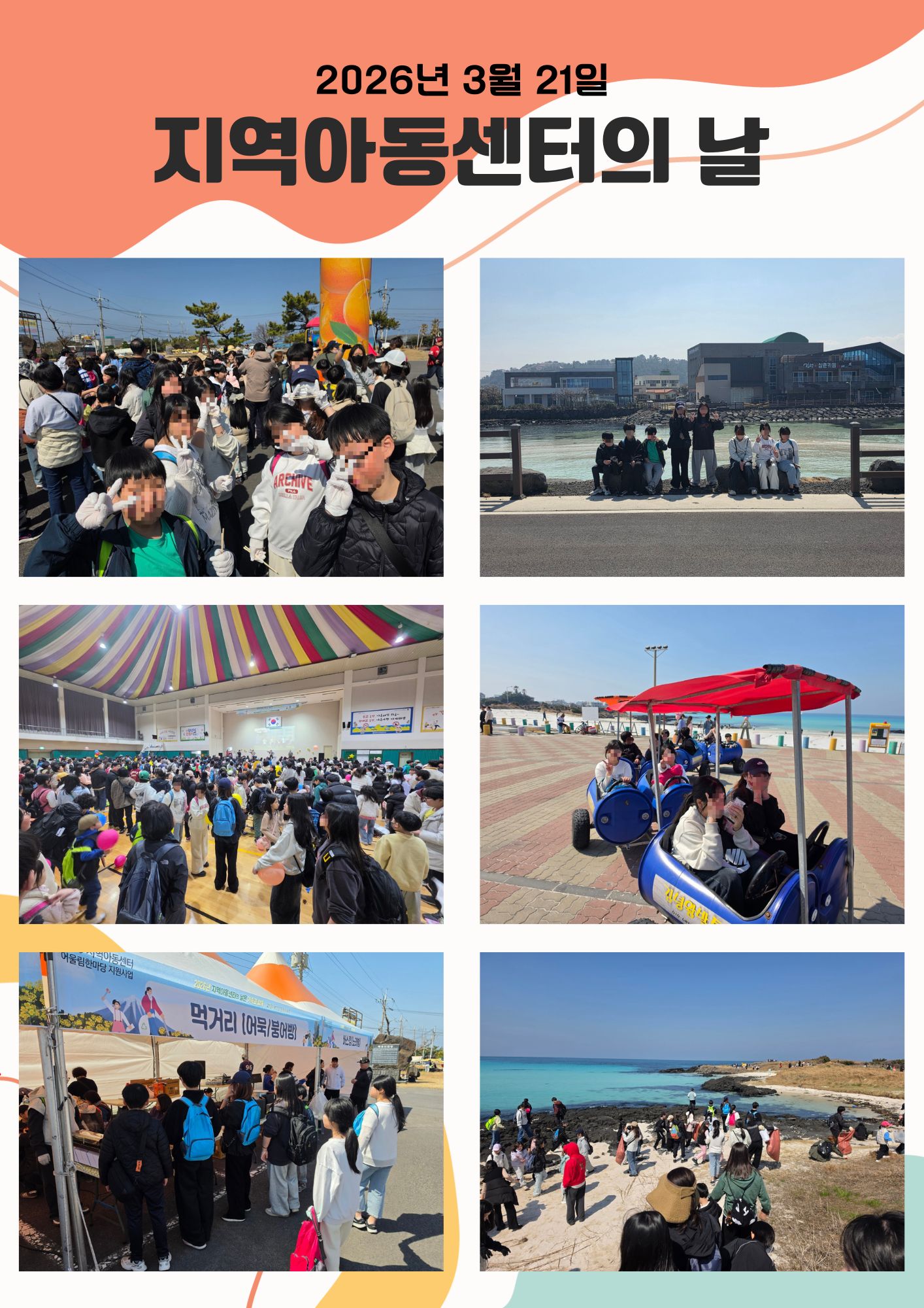 2026년 지역아동센터의 날 센터장 0 27 03.24 11:21 매년 찾아오는 지역아동센터의 날을 올해도 참여하게 되었습니다!이번에는 색다르게 플로깅을 하면서 김녕에 자연을 마주보며 일정이 진행되었습니다.생각보다 많은 쓰레기 양에 아동들이 많이 놀랐지만, 많은 쓰레기를 본 만큼 더 열심히 주우려고 하는 기특한 모습들을 보여줬습니다.또한, 점심시간을 이용해서 해안가를 걸으며 스트레스도 날려보냈습니다.마지막으로 깡통 열차를 타면서 시원한 바람을 맞으며 마무리를 지었습니다~~!