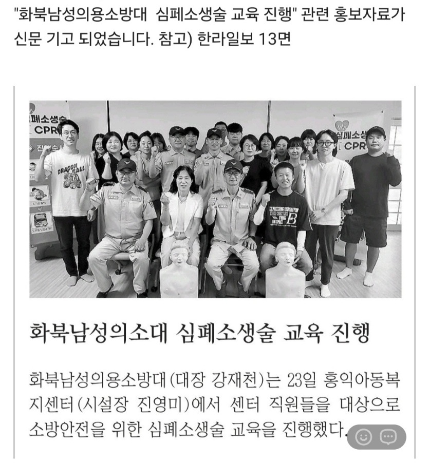 4분의 기적! 생명 구하기 자립스토리 0 63 09.25 14:57 9월 23일 화북남성의용소방대와 함께 직원안전교육을 실시하였습니다.이날 교육 성과는 9월 24일자 한라일보에도 올랐는데요.심폐소생술과 자동심장충격기 실습을 할 수 있었던 유익한 시간이었습니다.