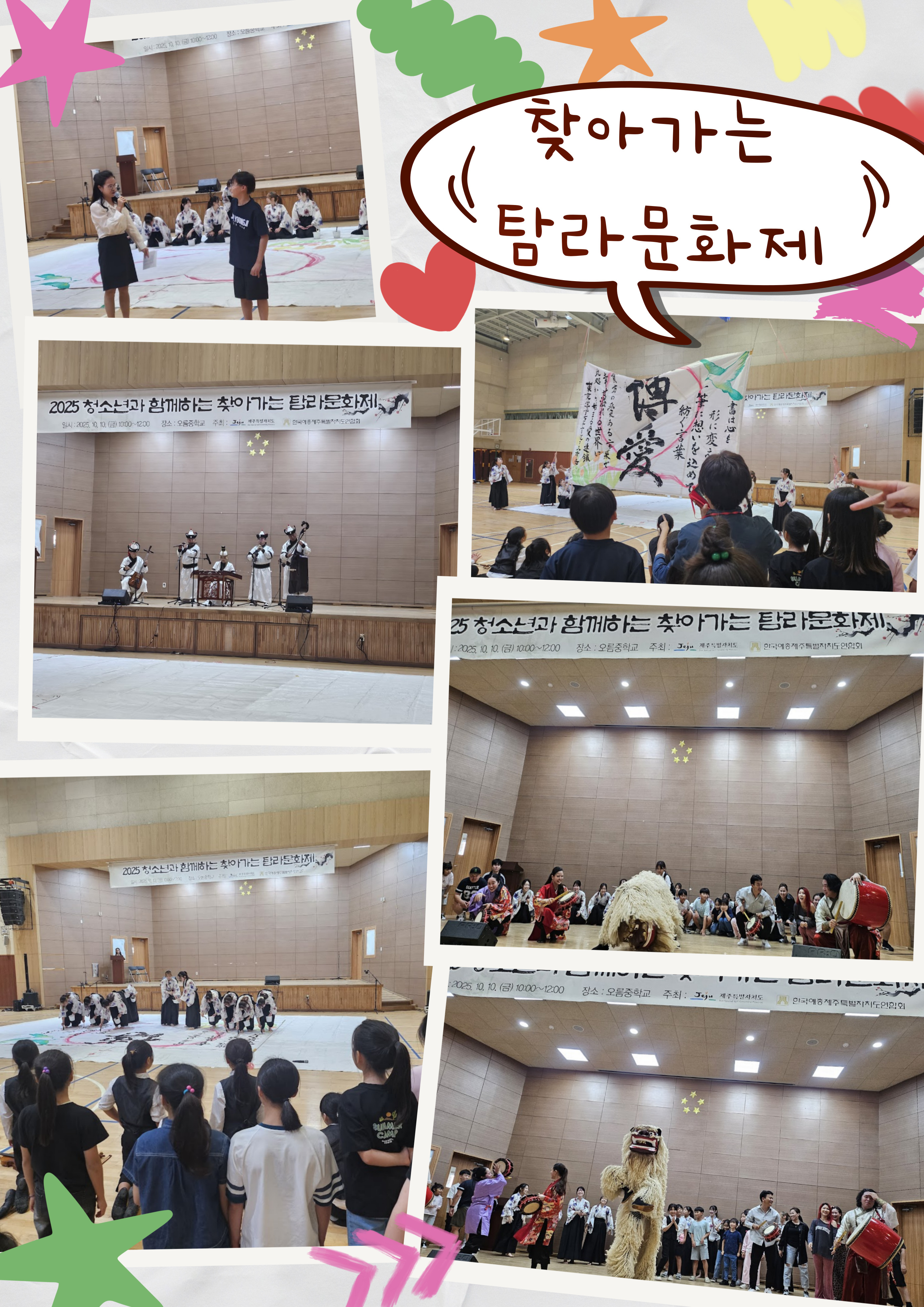 찾아가는 탐라문화제 최고관리자 0 49 10.10 15:43 2025 청소년과 함께하는 찾아가는 탐라문화제탐라문화제 국제문화교류 행사로 해외 교류도시 공연팀의 공연을 관람하였습니다. 이번 공연에는 몽골과 일본 공연팀이 참여하여 전통음악과 춤을 선보이며 다채로운 무대를 펼쳤습니다.아이들은 생생한 공연을 통해 문화와 예술이 주는 즐거움과 감동을 느끼며, 다른 나라의 문화를 이해하는 뜻깊은 시간을 보냈습니다.‘찾아가는 탐라문화제’를 통해 아동들이 새로운 문화예술을 경험하고 시야를 넓히는 소중한 기회가 되었습니다.