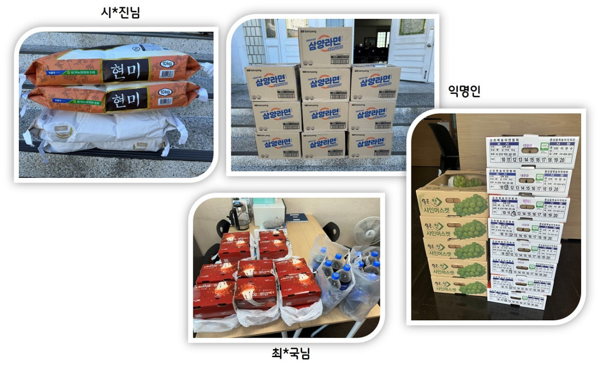 시*진님,최*국님,익명인 후원자님께 감사드립니다. 최고관리자 0 132 09.08 15:06 참조설명 : 모든 분들께 감사드립니다. - 시*진님(쌀20kg,현미20kg)- 최*국님(치킨20마리,음료)- 익명인(라면10박스,복숭아8박스,샤인머스캣5박스)아이들을 위해 따뜻한 사랑을 전해주신 모든 분들께 감사드립니다.