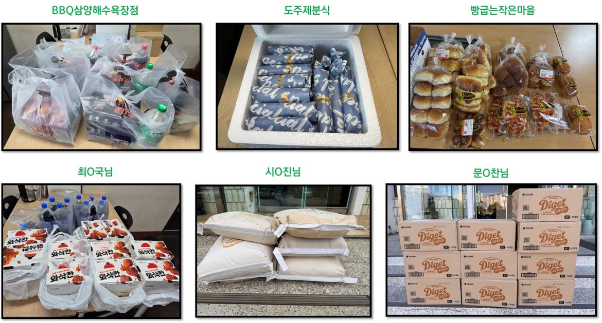 후원자님들께 감사드립니다. 최고관리자 0 49 03.04 11:22 참조설명 : 새해 복 많이 받으세요. - BBQ삼양해수욕장점(치킨16마리)- 도주제분식(두쫀쿠김밥51개)- 빵굽는작은마을(식빵11개,빵20개)- 최O국님(치킨20마리)- 시O진님(쌀60kg)- 문O찬님(과자10박스)