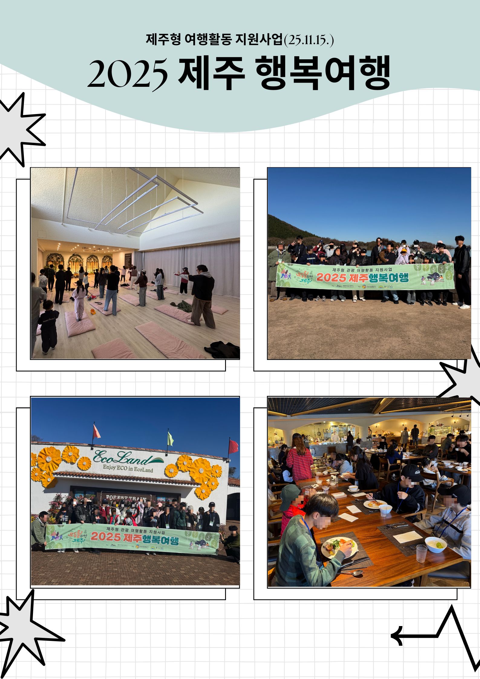 2025 제주 행복여행 프로그램 센터장 0 40 11.17 11:52 25년 11월 15일(토) 제주관광공사에서 지원한 제주 행복여행 아동, 보호자, 가족이 함께하는 프로그램으로 진행하였다. 돌문화 공원, 미술관 관람, 클래식공연, 미술작품 해설 투어, 에코랜드 테마파크 산림 기차투어, 힐링과 명상, 에코랜드 호텔 레스토랑에서 브런치 건강뷔페로 품격있는 특별한 맛을 경험하였으며,숲치유 붉은 오름과 힐링명상을 통해 신체활동, 정서적 안정, 건강과 치유를 체험하며 행복한 여행이 되었다.