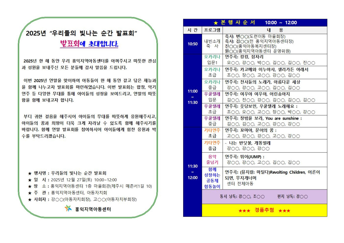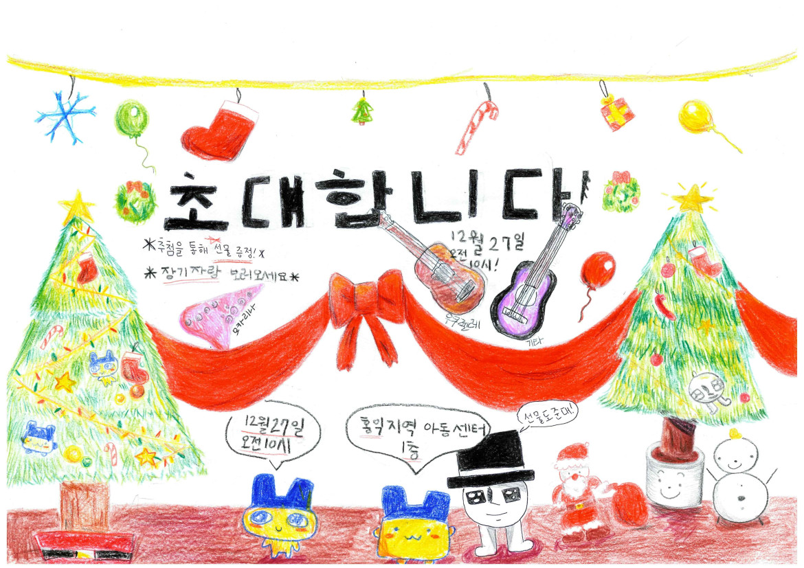 2025 홍익지역아동센터 '우리들의 빛나는 순간 발표회' 센터장 0 168 2025.12.11 18:28 안녕하세요이번 2025년 연말을 맞이하여 우리 센터에서 발표회를 진행하려고 합니다.'우리들의 빛나는 순간 발표회'라는 프로그램으로 아동들이 1년동안 열심히 배워왔던 재능을 보호자님들과 지역사회 주민분들 앞에서 선보이고자 합니다.바쁘시겠지만 아이들을 위해 참여하시어 응원과 박수를 보내줌으로써 활기찬 한해의 마무리를 전달해주셨으면 합니다.일시: 2025년 12월 27일 10시~장소: 홍익지역아동센터 1층(매촌서 1길 10)